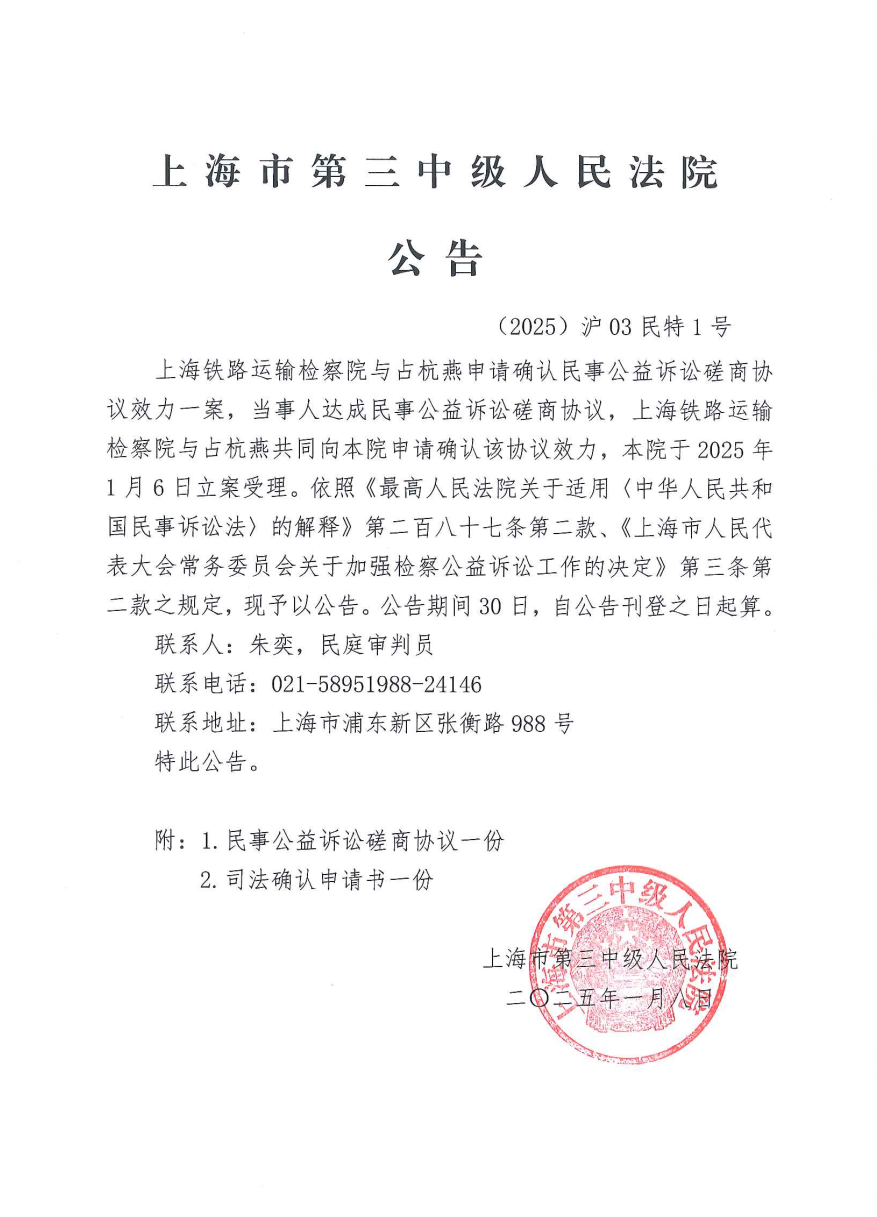 上海铁路运输检察院与占杭燕申请确认民事公益诉讼磋商协议效力案公告