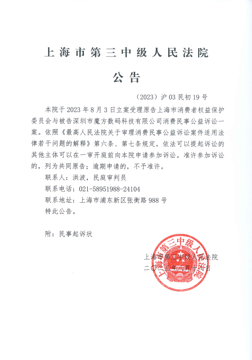 上海市消费者权益保护委员会诉深圳市魔方数码科技有限公司消费者权益保护民事公益诉讼案公告