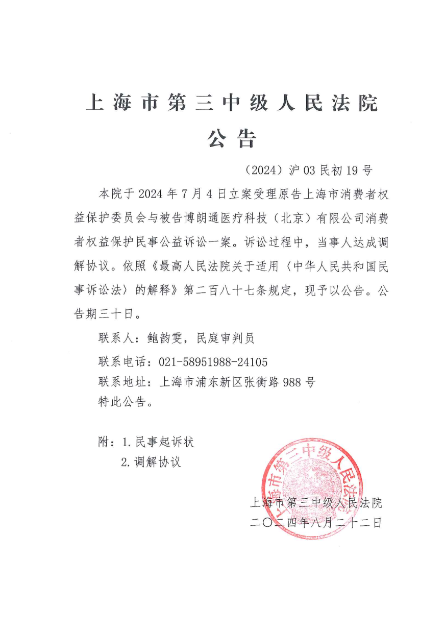 上海市消费者权益保护委员会诉博朗通医疗科技(北京)有限公司消费者权益保护民事公益诉讼公告
