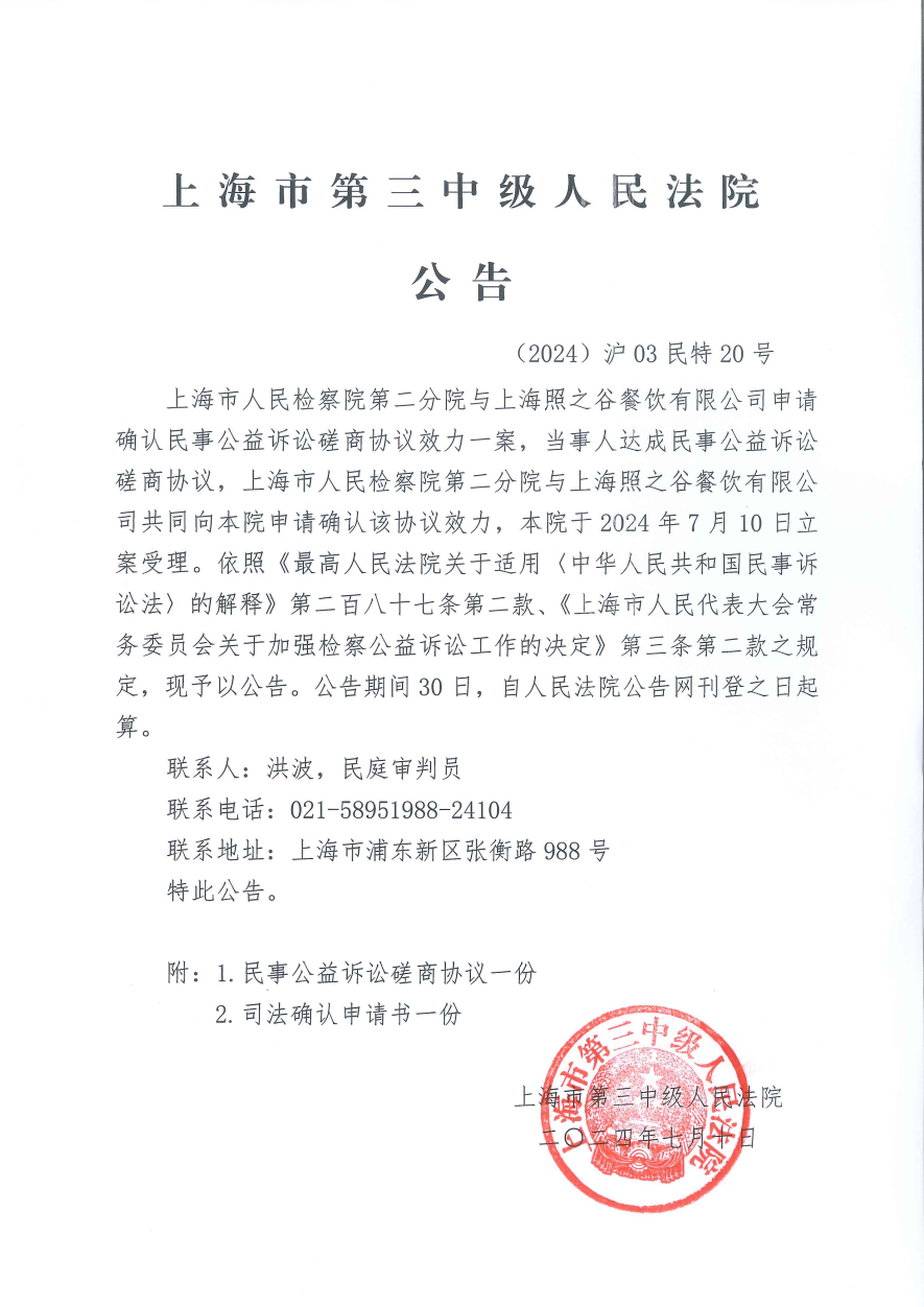 上海市人民检察院第二分院与上海照之谷餐饮有限公司申请确认民事公益诉讼磋商协议效力案公告