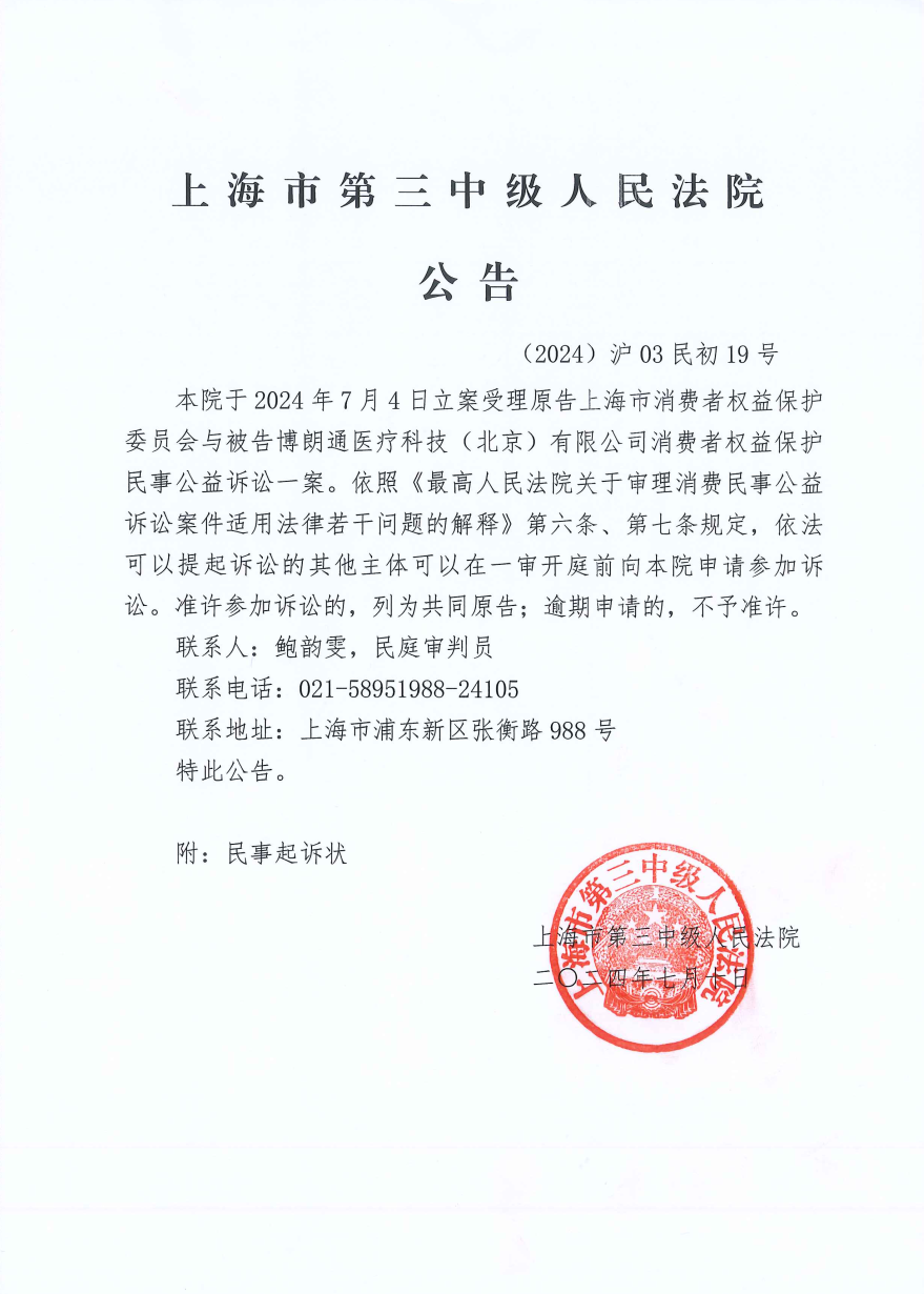 上海市消费者权益保护委员会诉博朗通医疗科技(北京)有限公司消费者权益保护民事公益诉讼案公告