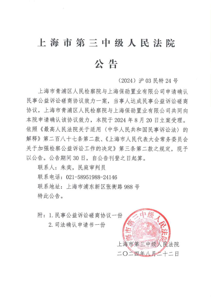 上海市青浦区人民检察院与上海保劭置业有限公司申请确认民事公益诉讼磋商协议效力案公告