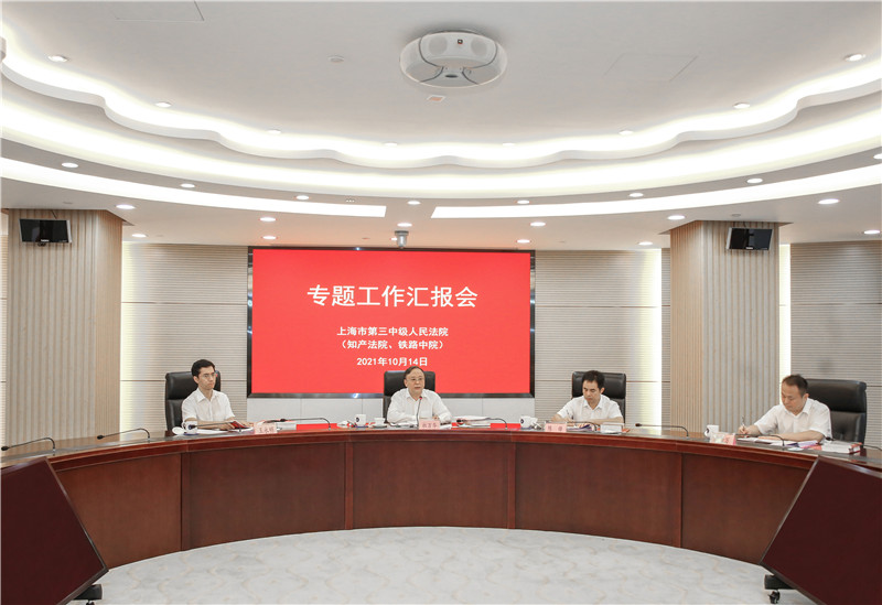 2021年10月14日下午,全国政法队伍教育整顿中央第六督导组副组长杜万华、中央第六督导组上海小组副小组长陈锋一行到上海三中院(知产法院、铁路中院)下沉督导队伍教育整顿并听取专题工作汇报。上海高院党组成员、副院长黄祥青和市教育整顿办相关同志参加督导,上海高院、上海三中院相关负责同志陪同。