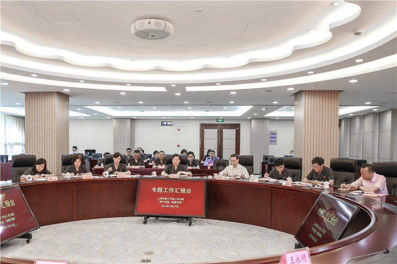 上海三中院党组书记、院长、队伍教育整顿领导小组组长陈亚娟汇报了队伍教育整顿工作的开展情况、存在不足及下一步工作打算,上海三中院(知产法院)副院长黎淑兰、上海三中院副院长(上海破产法庭庭长)俞秋玮分别汇报了知产法院和破产法庭工作。