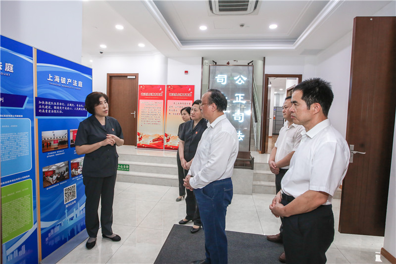 中央督导组一行实地检查督导了上海三中院诉讼服务中心、破产法庭、智慧法庭等场所,视察了知产法院工作展板,详细了解了破产办理效果、行政案件集中管辖、法院队伍建设等方面的工作情况。